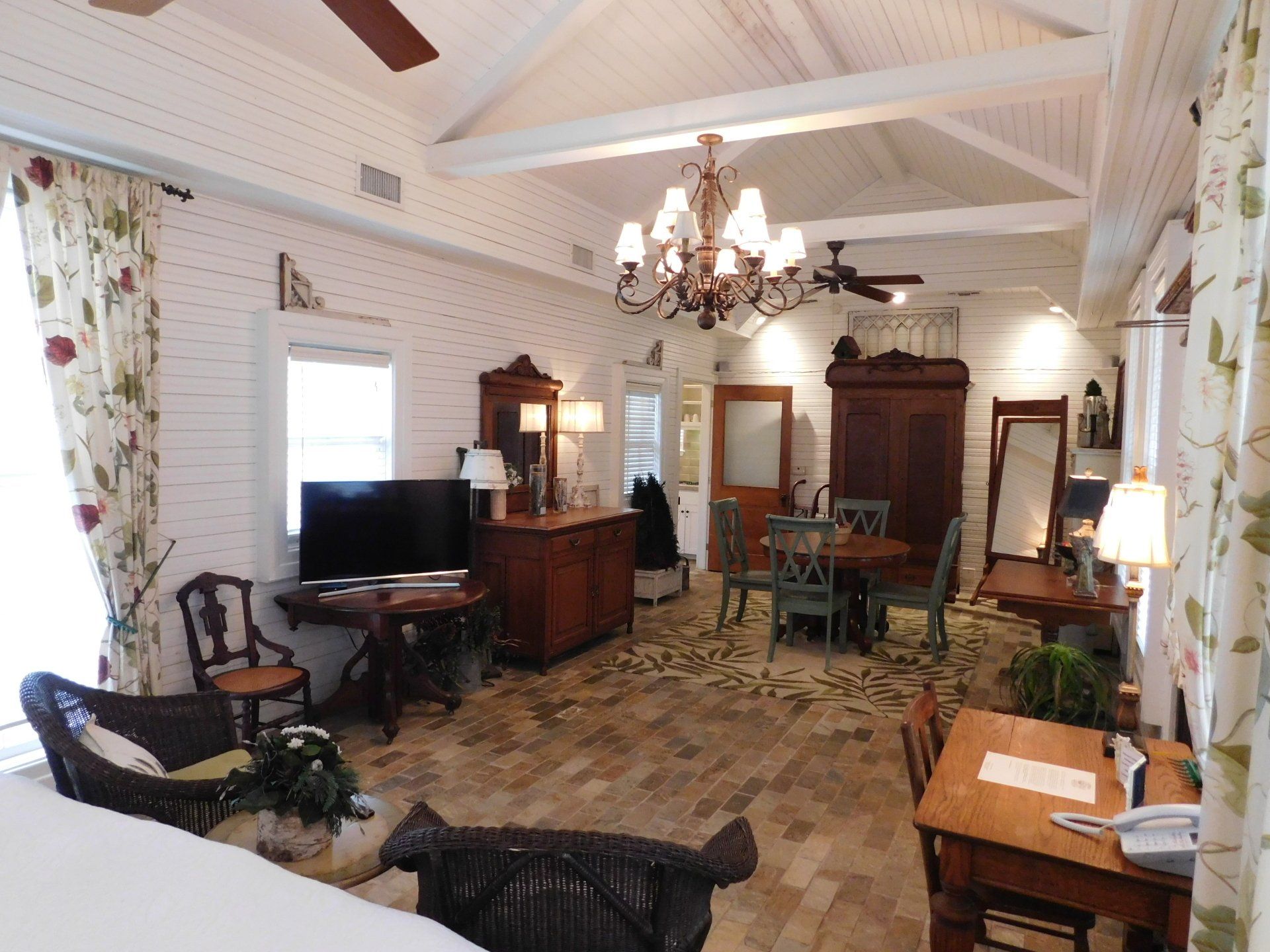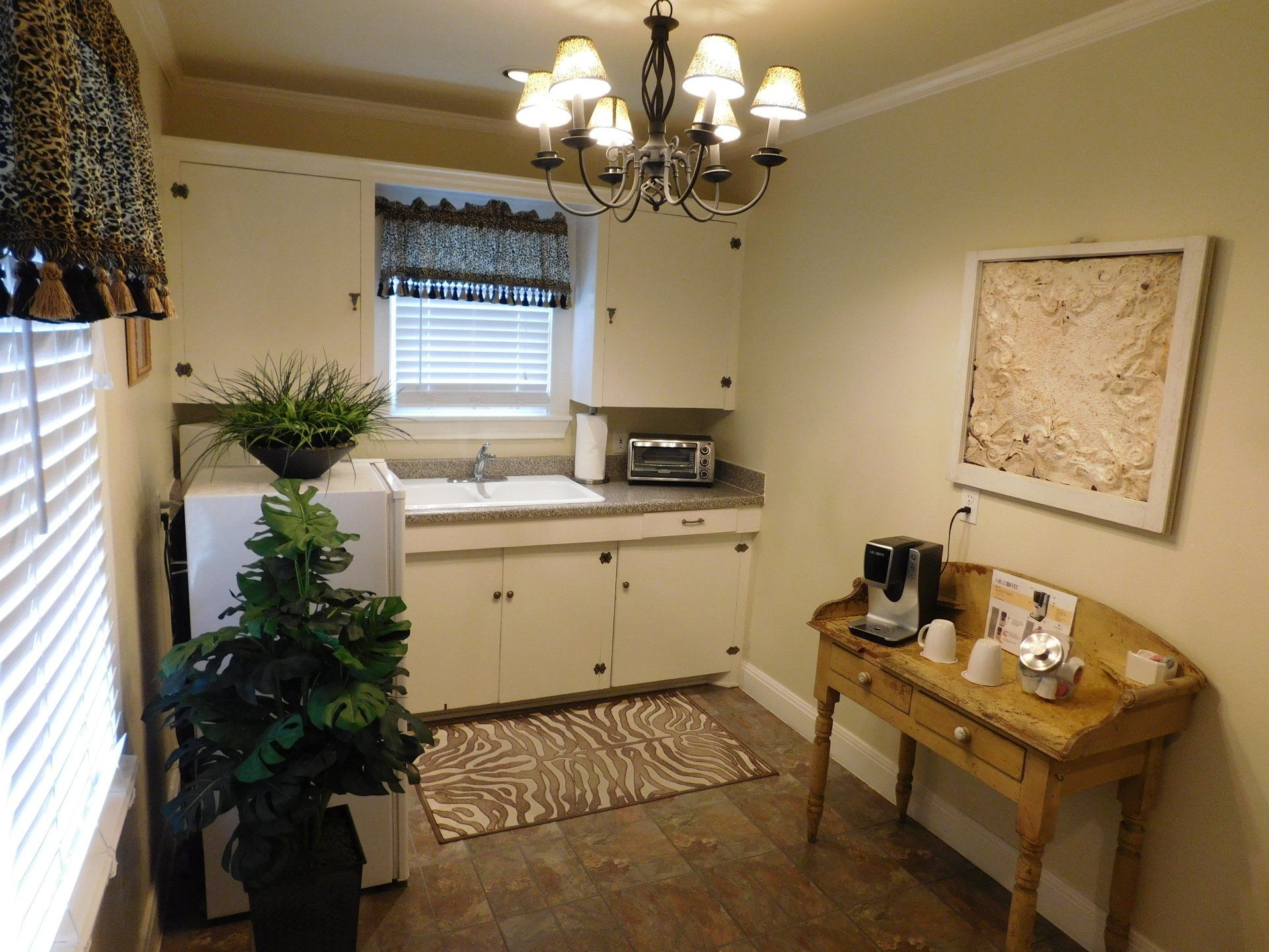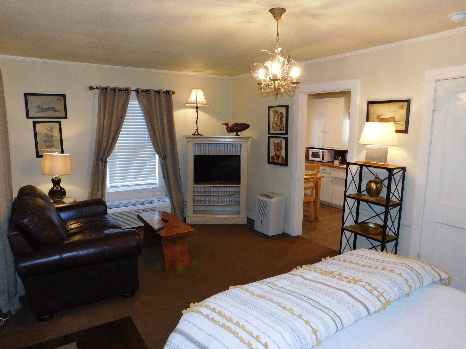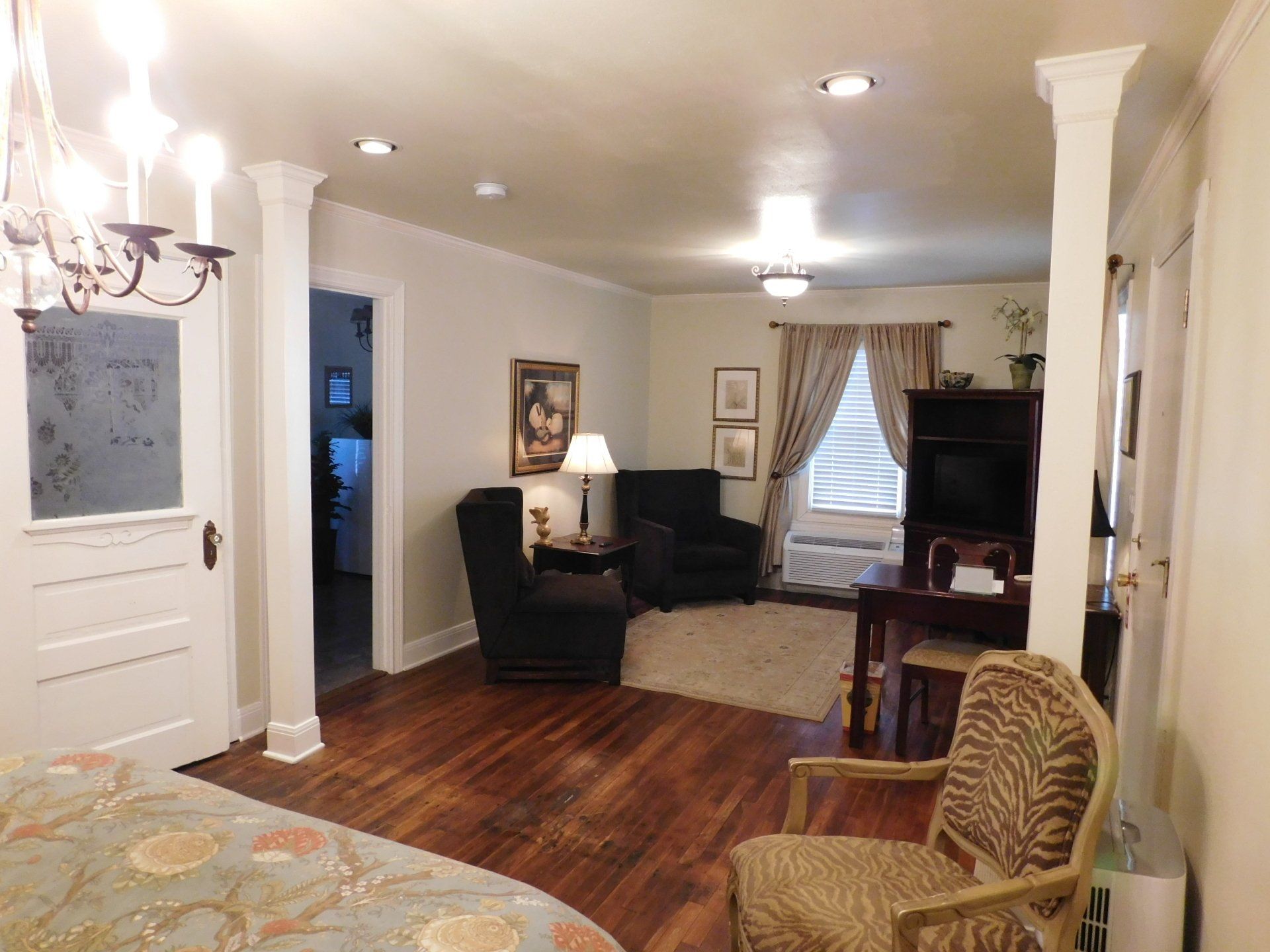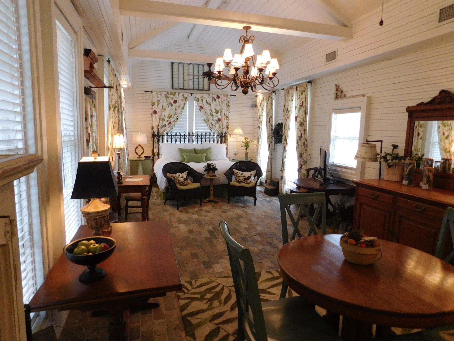 Once the original laundry facility, today this renovated luxury suite with a King-sized bed features several tall and beautiful windows that face the central lawn area and rear French Doors which open to a private patio overlooking a private garden. In addition, there is a full kitchen and this room is ADA compliant.