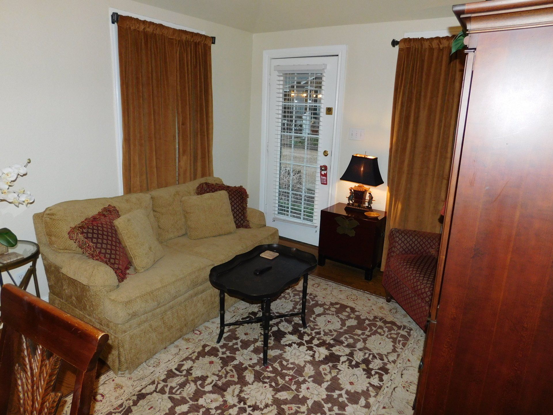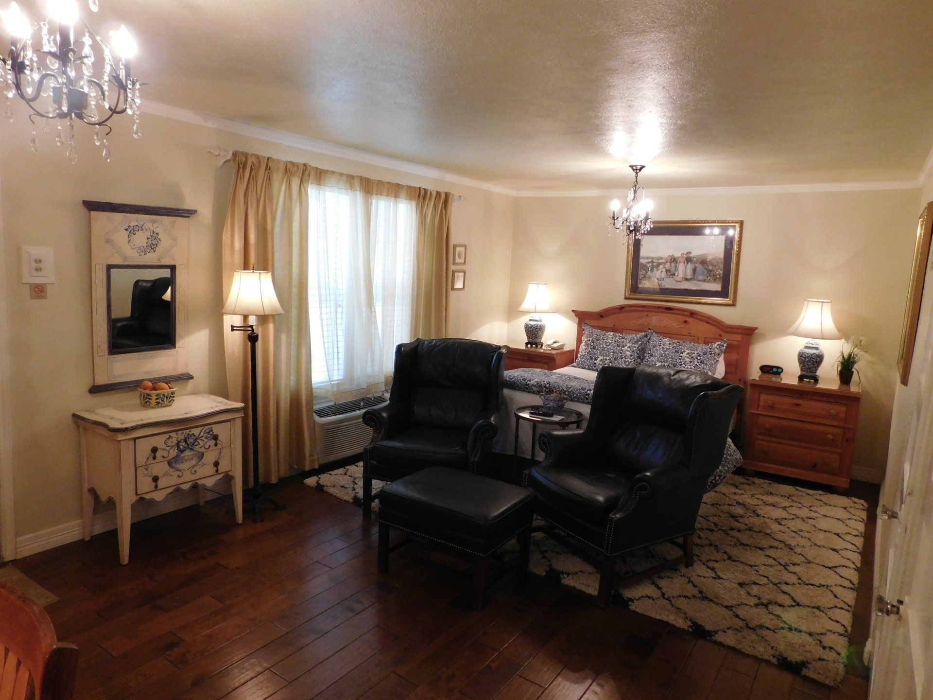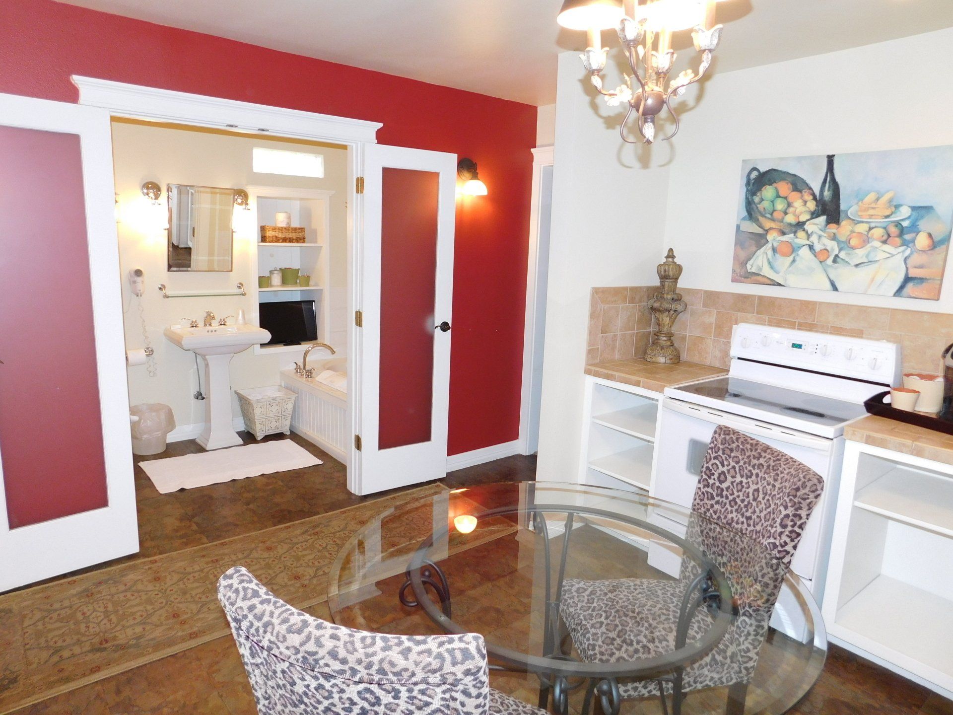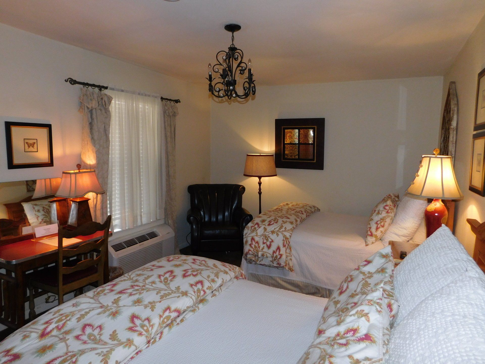 Once the original laundry facility, today this renovated luxury suite with a King-sized bed features several tall and beautiful windows that face the central lawn area and rear French Doors which open to a private patio overlooking a private garden. In addition, there is a full kitchen and this room is ADA compliant.