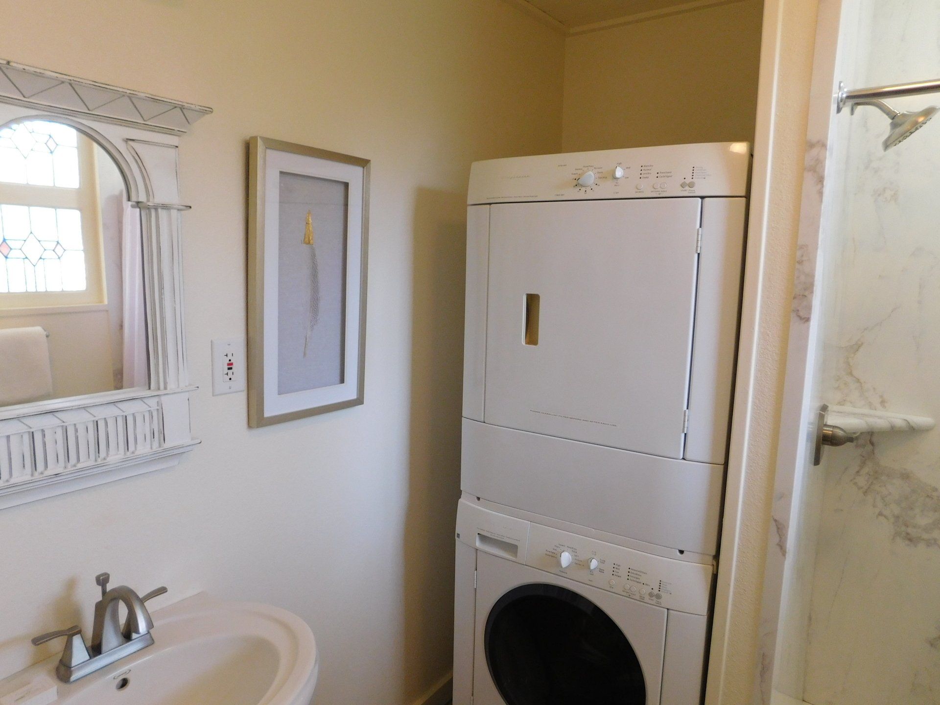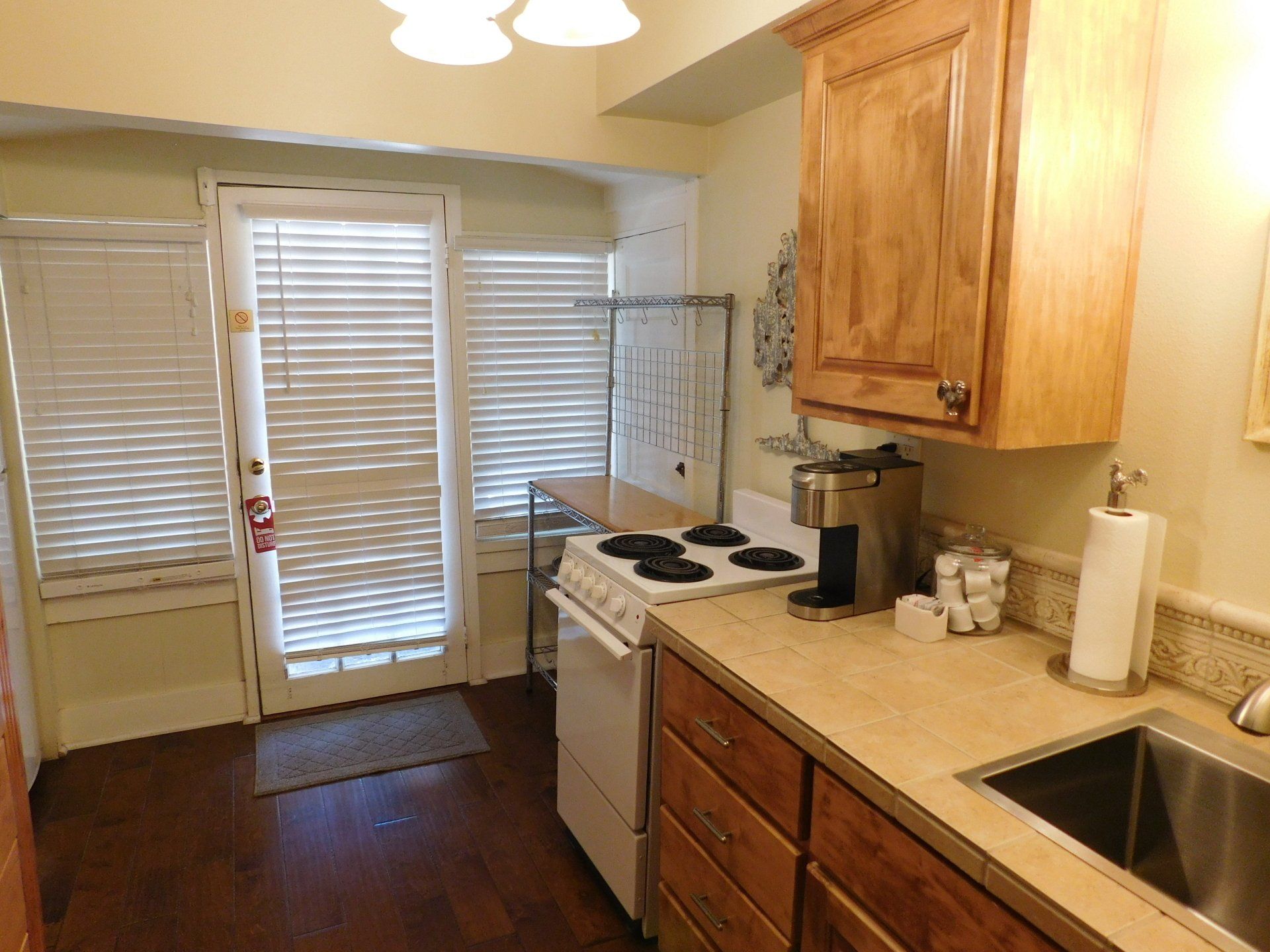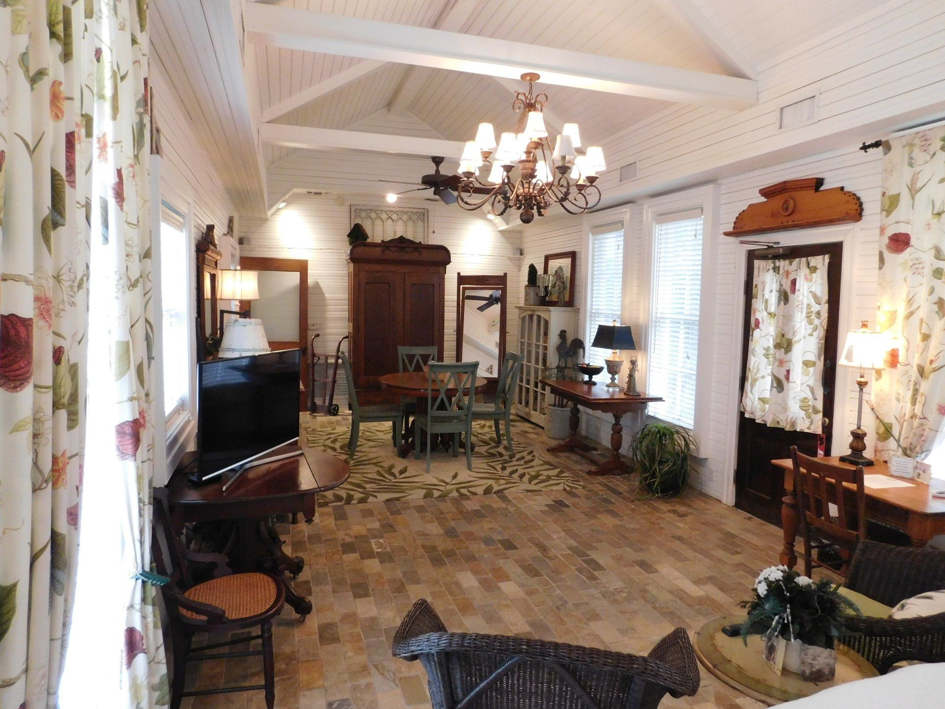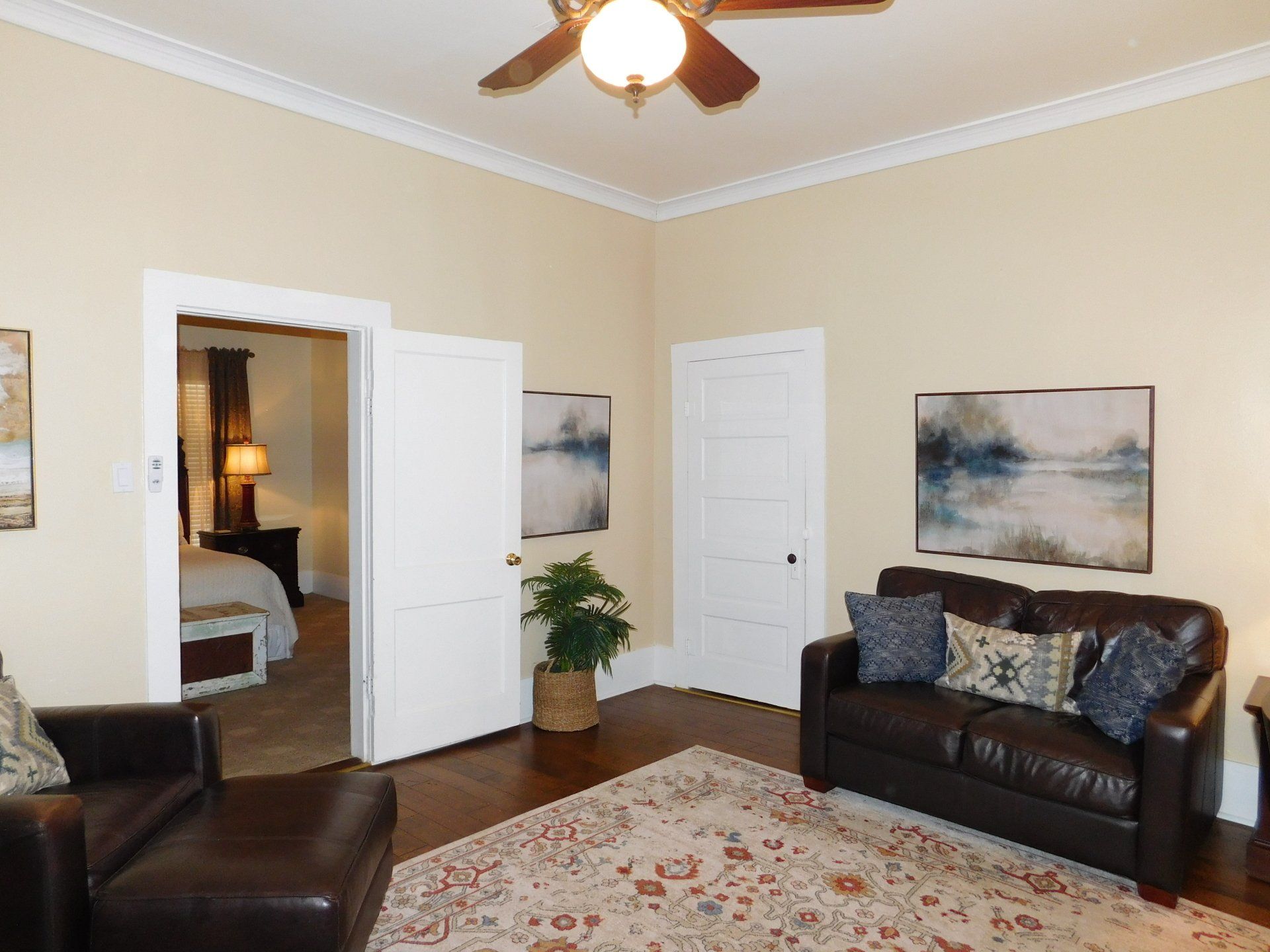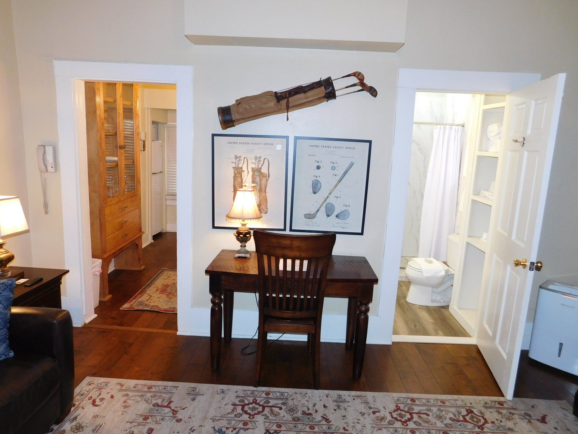 Once the original laundry facility, today this renovated luxury suite with a King-sized bed features several tall and beautiful windows that face the central lawn area and rear French Doors which open to a private patio overlooking a private garden. In addition, there is a full kitchen and this room is ADA compliant.