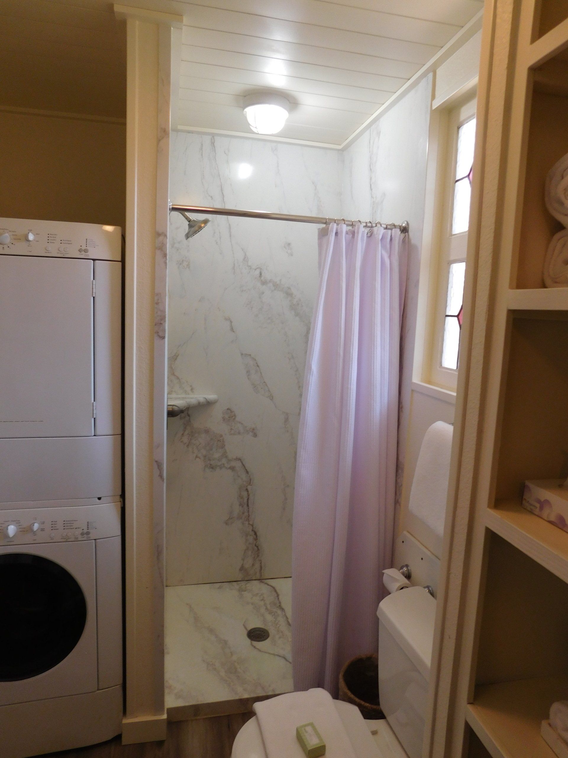 This is a large stand alone cottage with a queen bed and living room, eat-in kitchen and large bathroom with a tub shower combination.