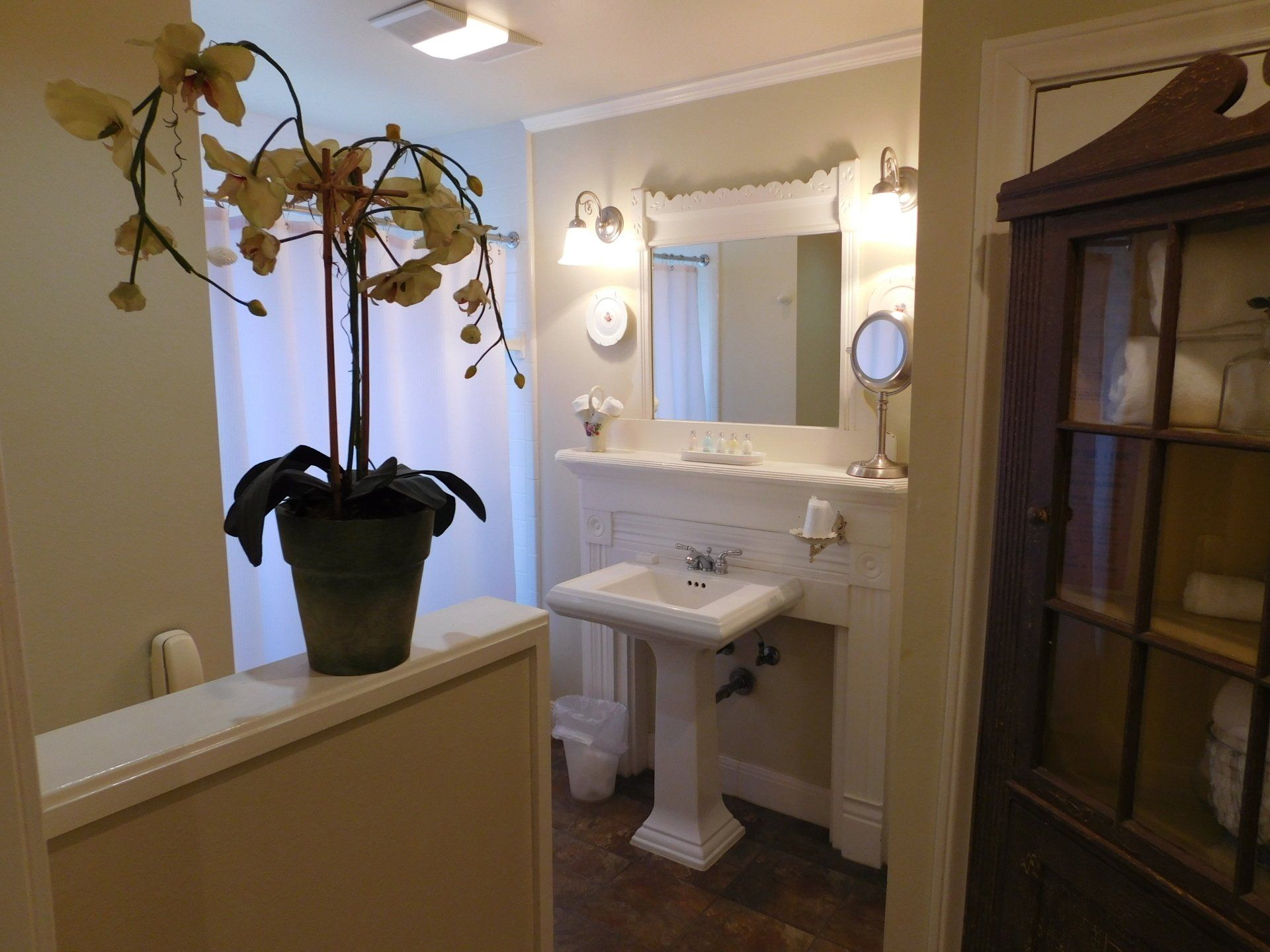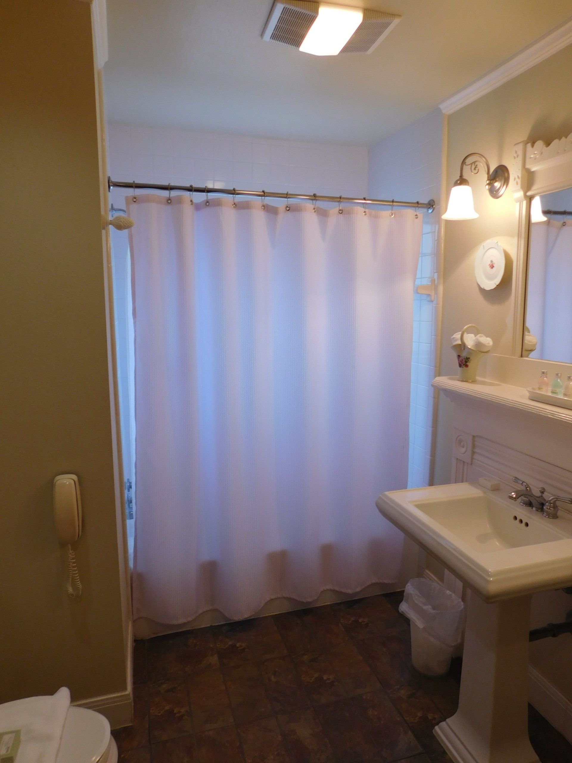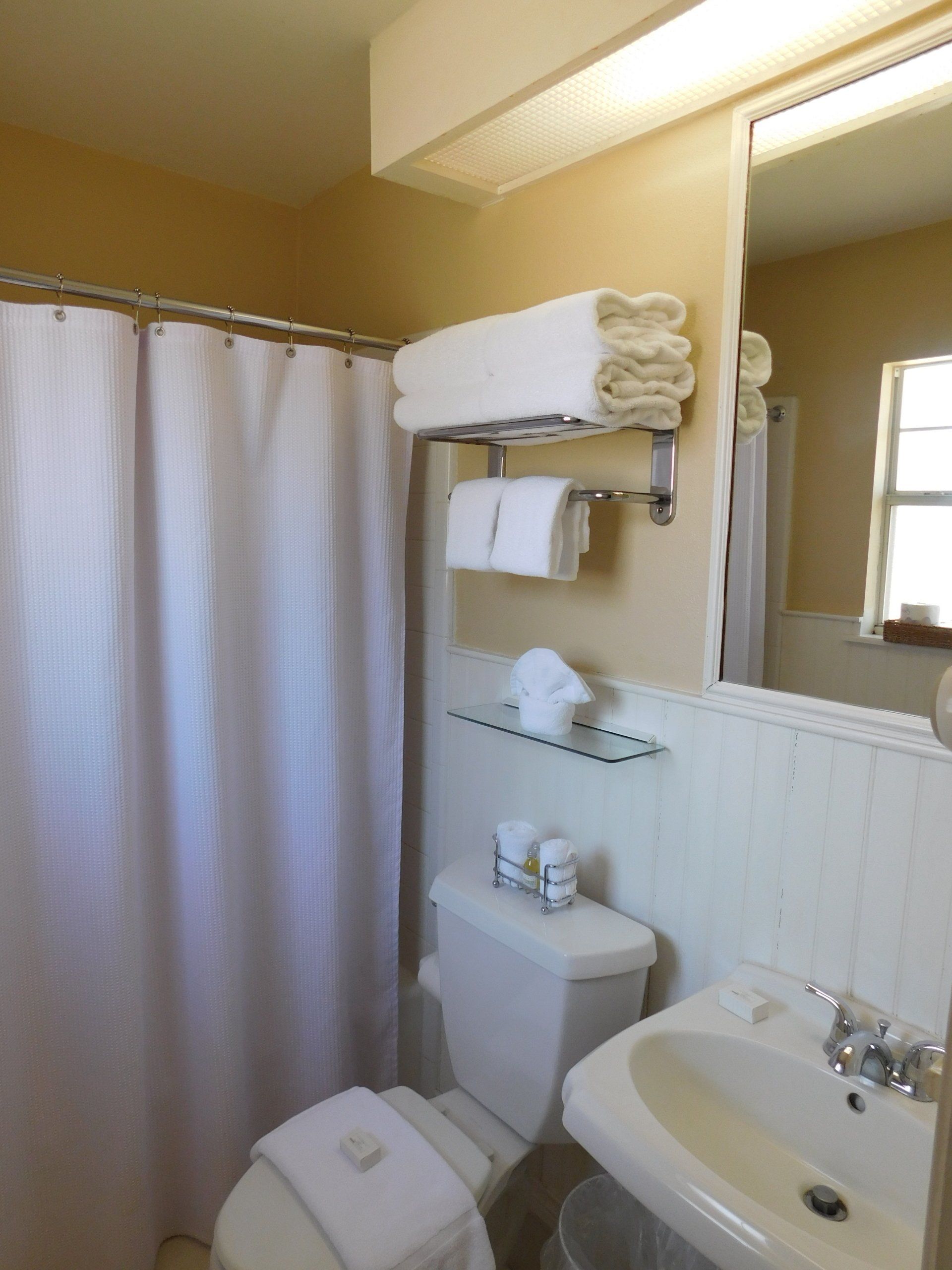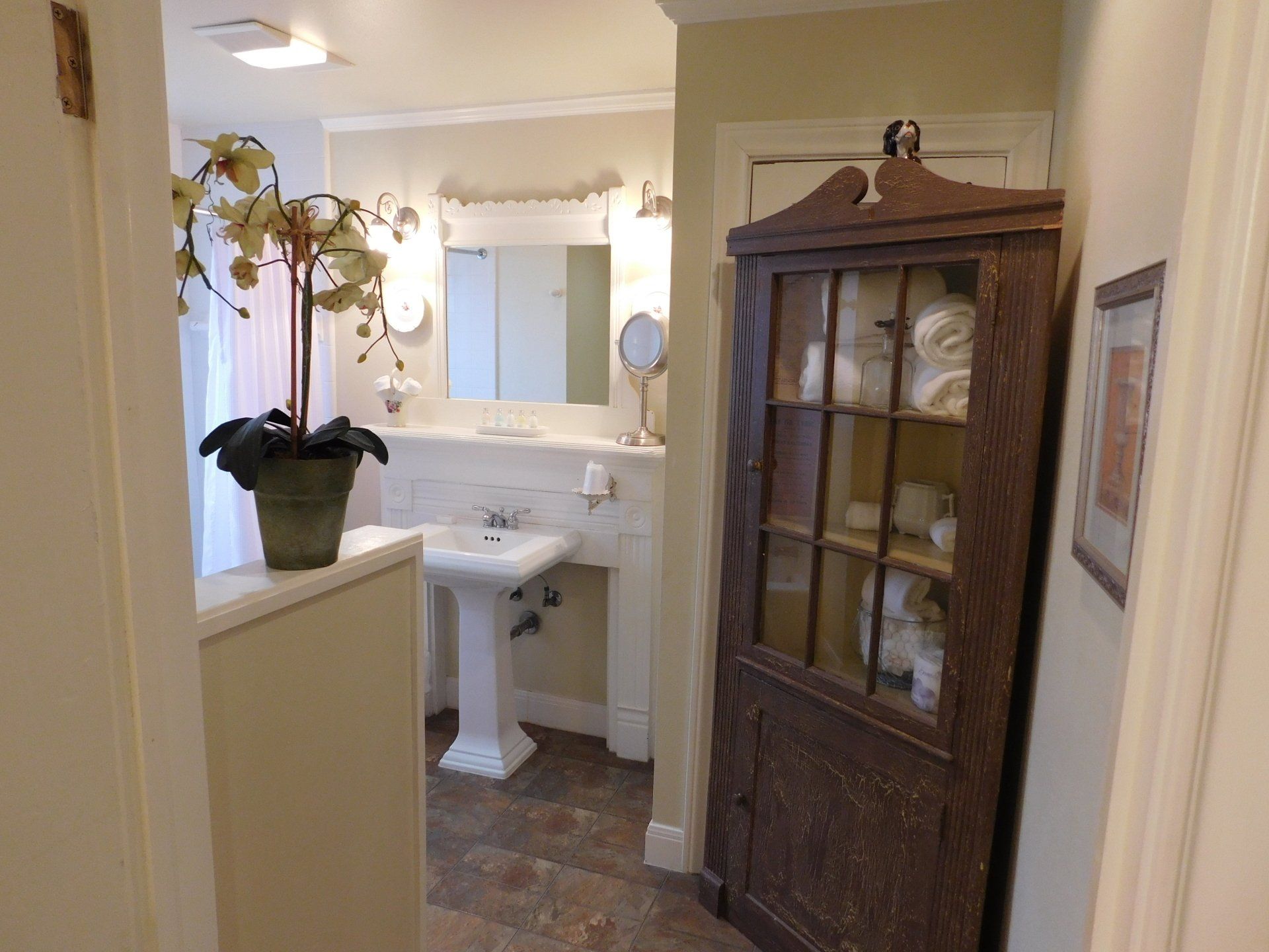 The door going into the bathroom is one of the remaining original etched glass doors that dates back to the beginning of the motel. In addition, the bath is large enough to accommodate an antique corner cabinet to hold linens and bath products.
