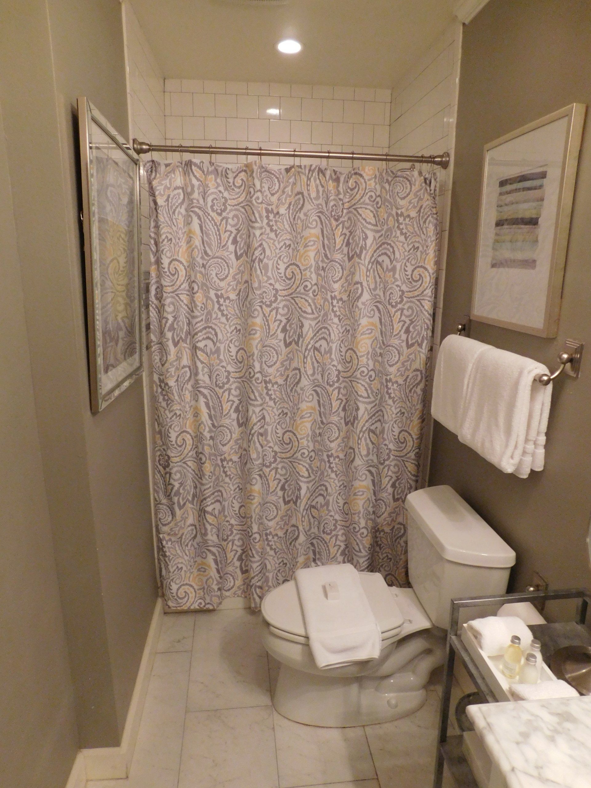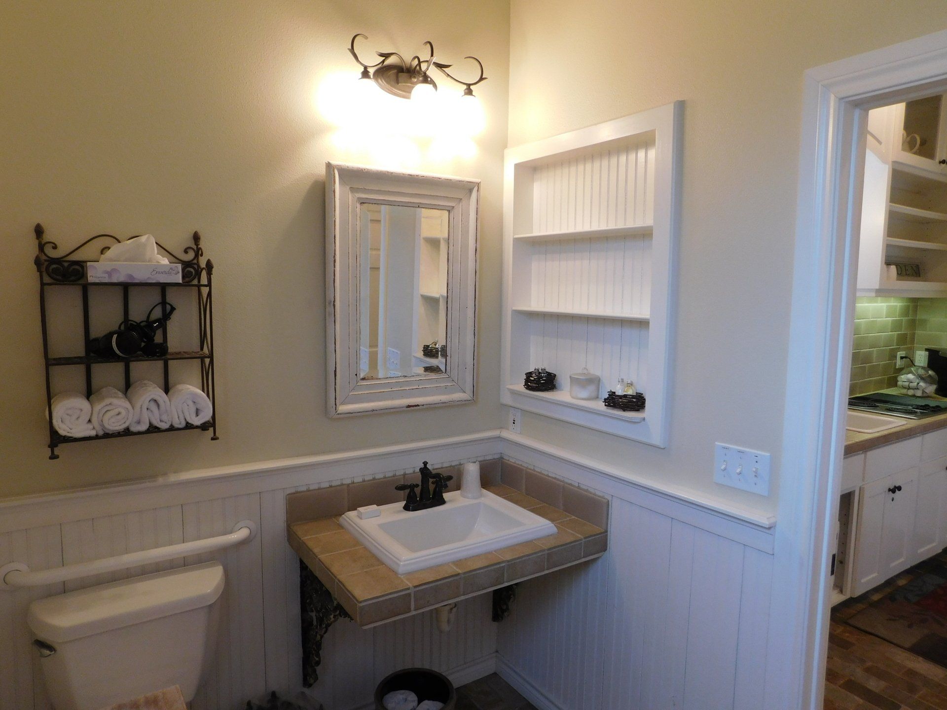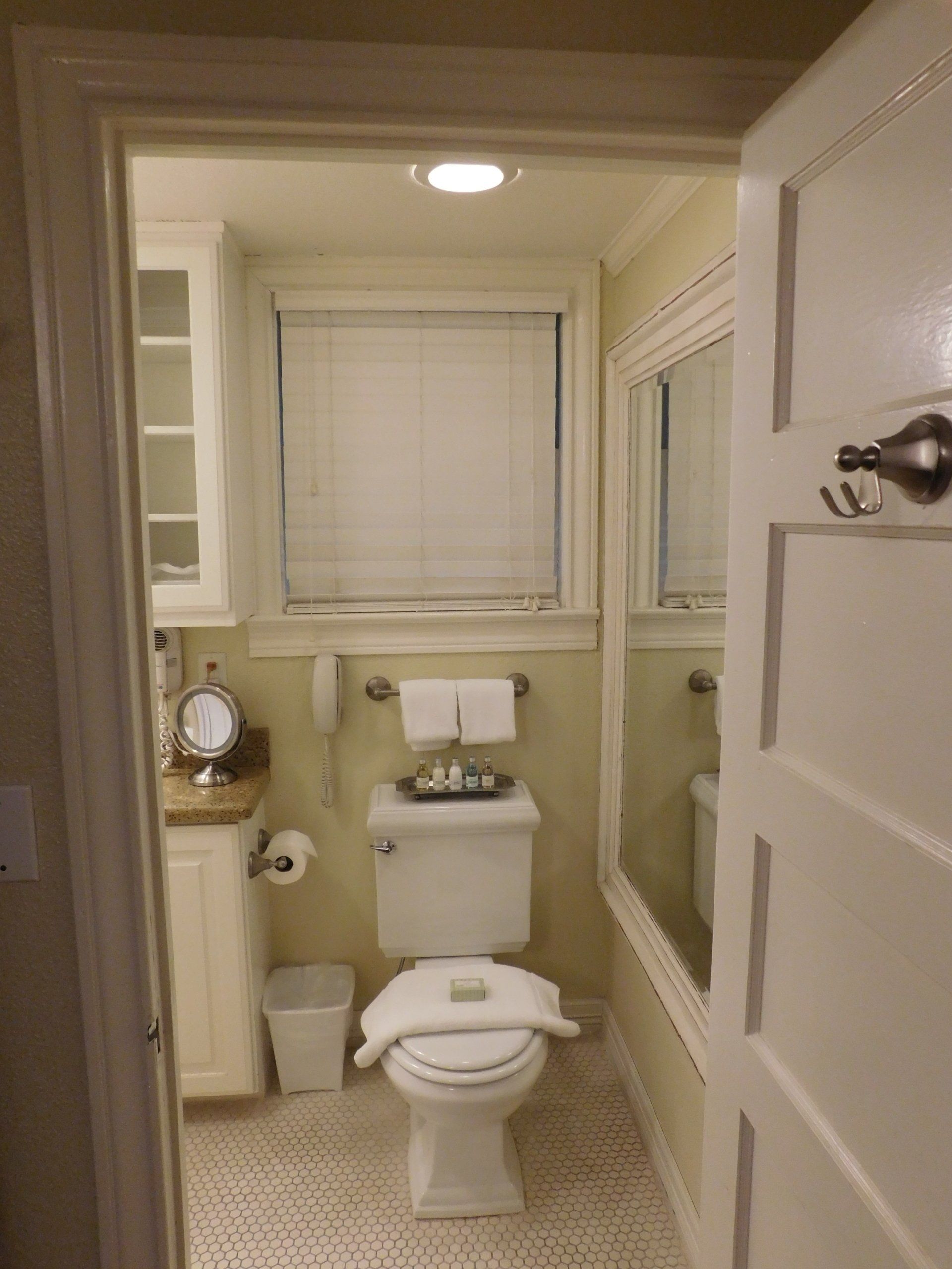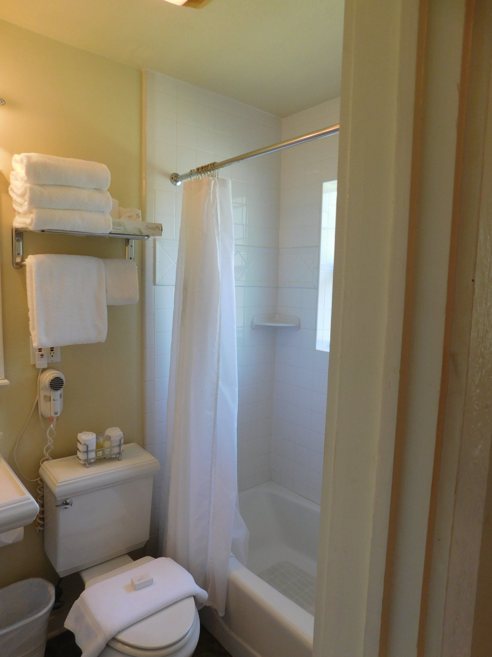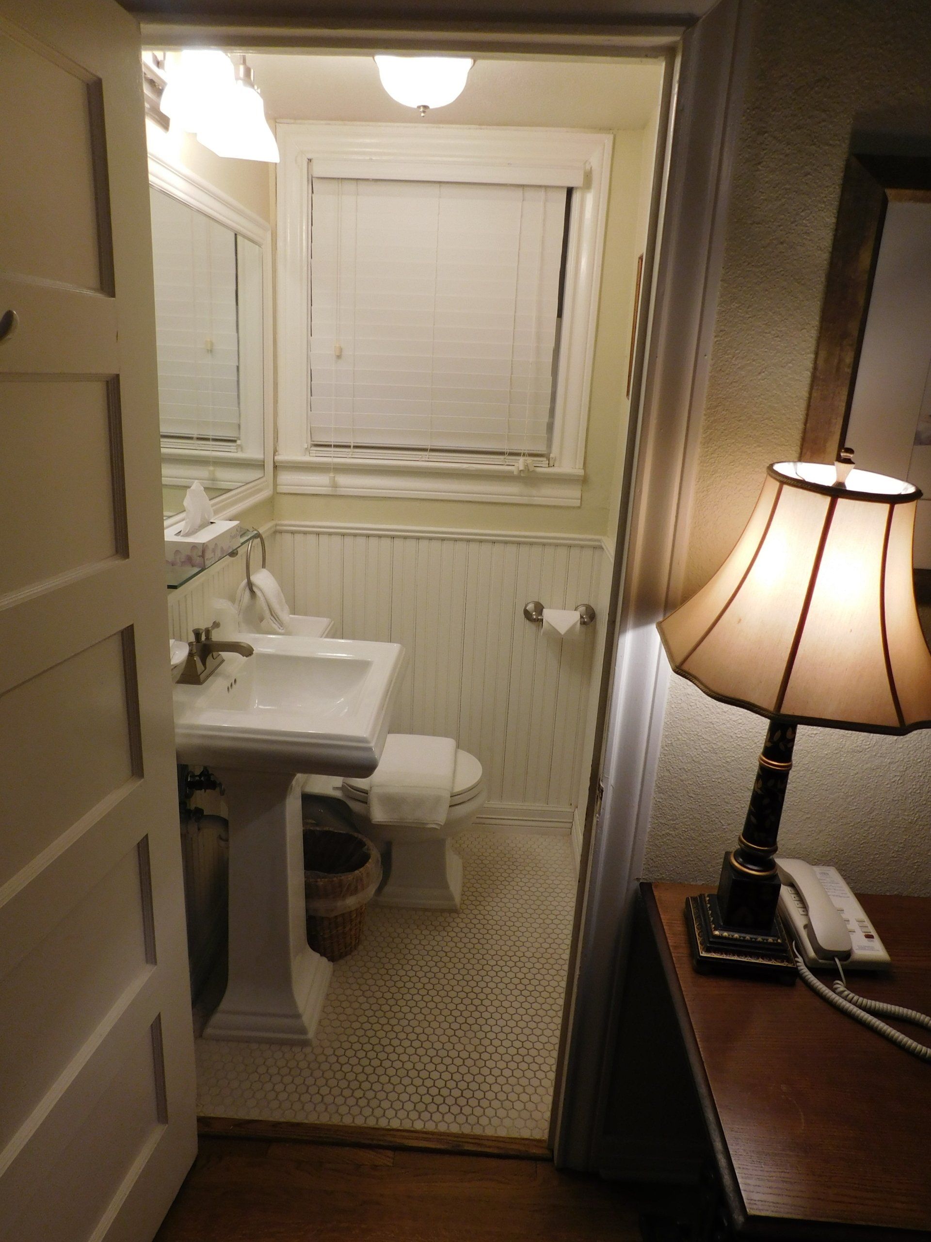 The door going into the bathroom is one of the remaining original etched glass doors that dates back to the beginning of the motel. In addition, the bath is large enough to accommodate an antique corner cabinet to hold linens and bath products.