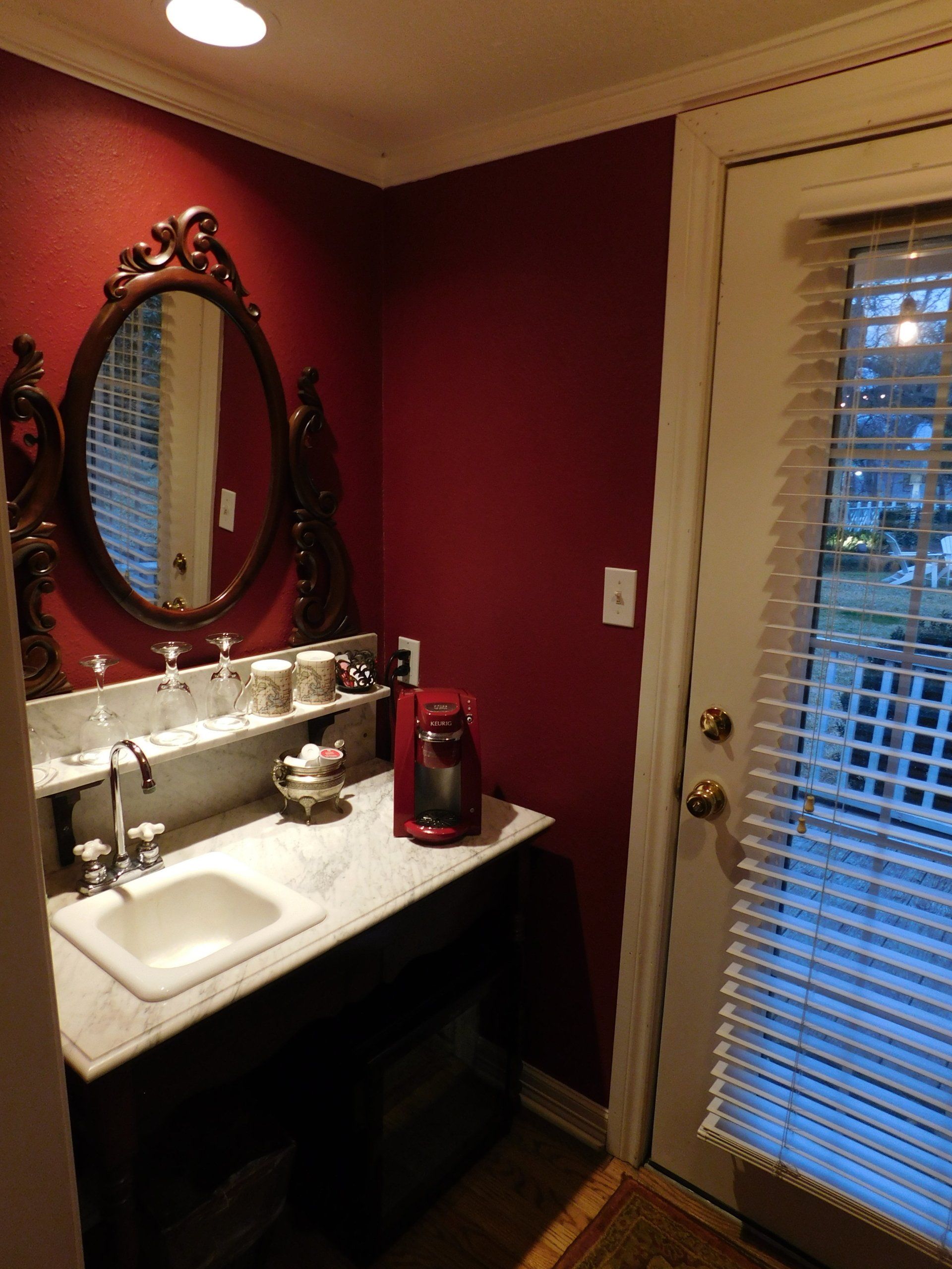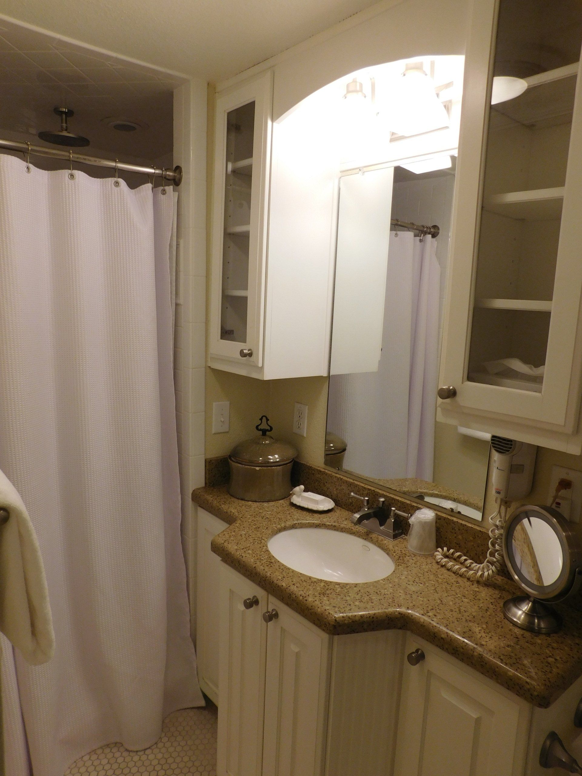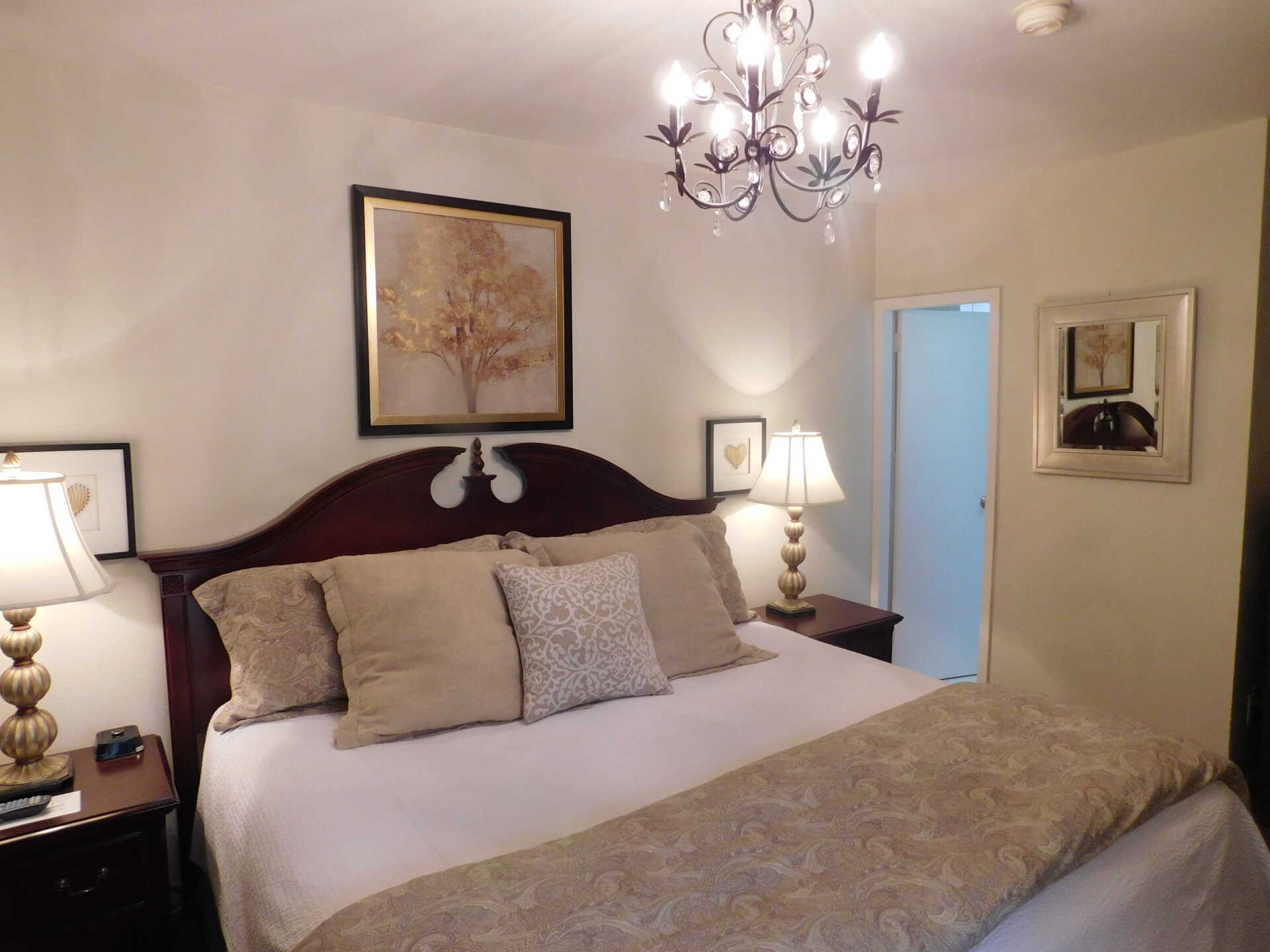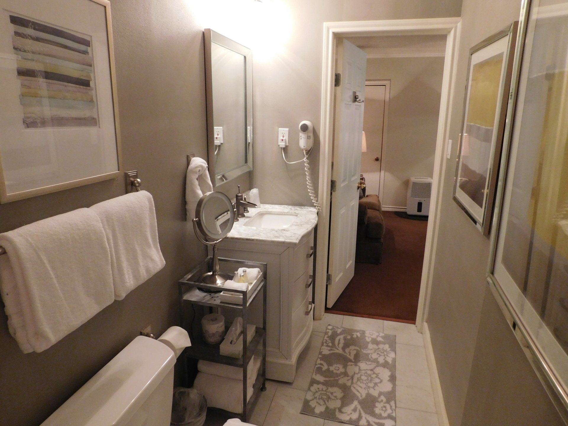 This room also includes a small refrigerator, microwave and coffee service. In addition, the bathroom was recently remodeled with a marble shower.