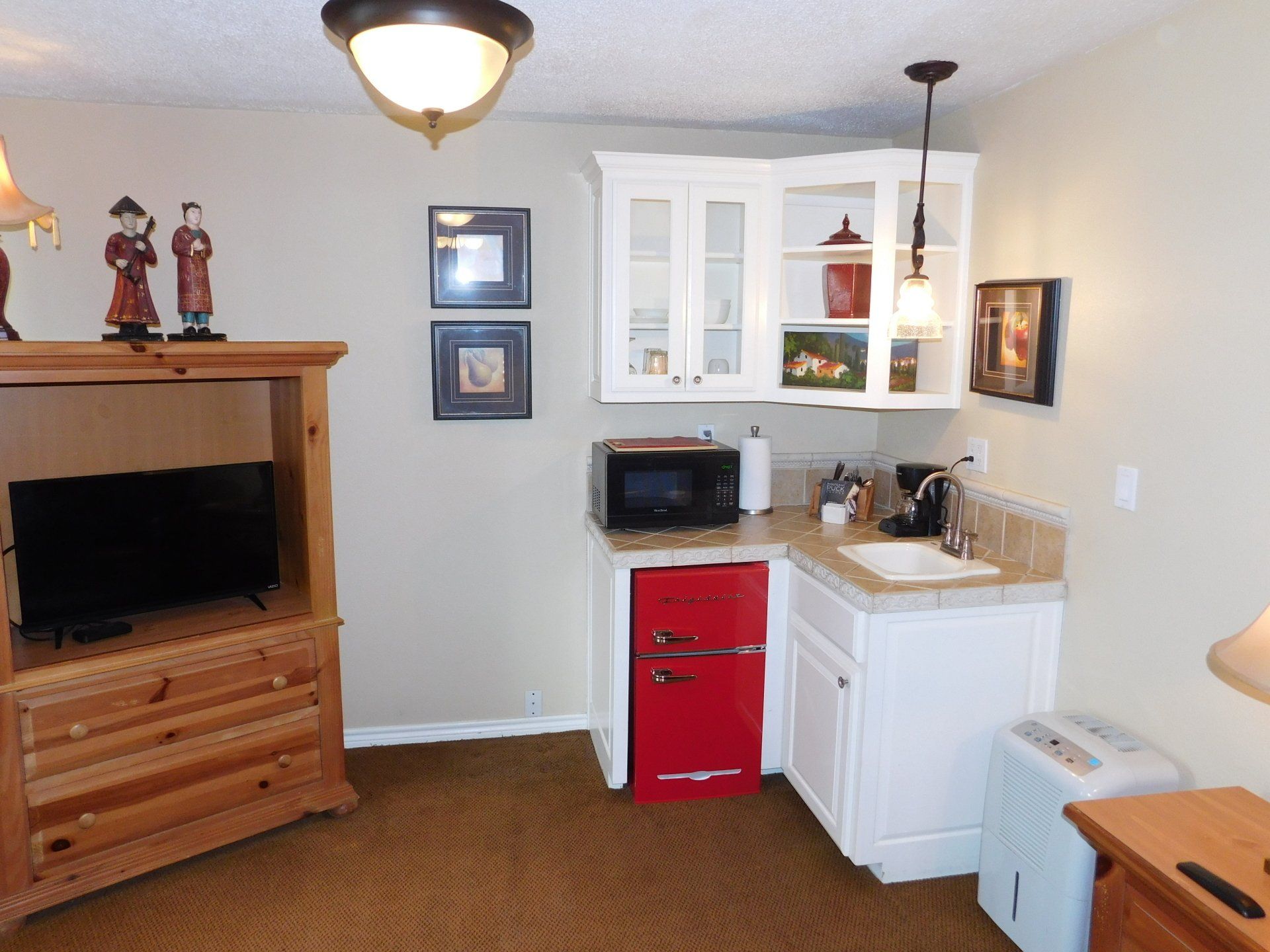Unlike the other Queen Suites, this room does not have a full kitchen but rather a "Galley Kitchen Area" with a refrigerator, sink, microwave and ample storage.